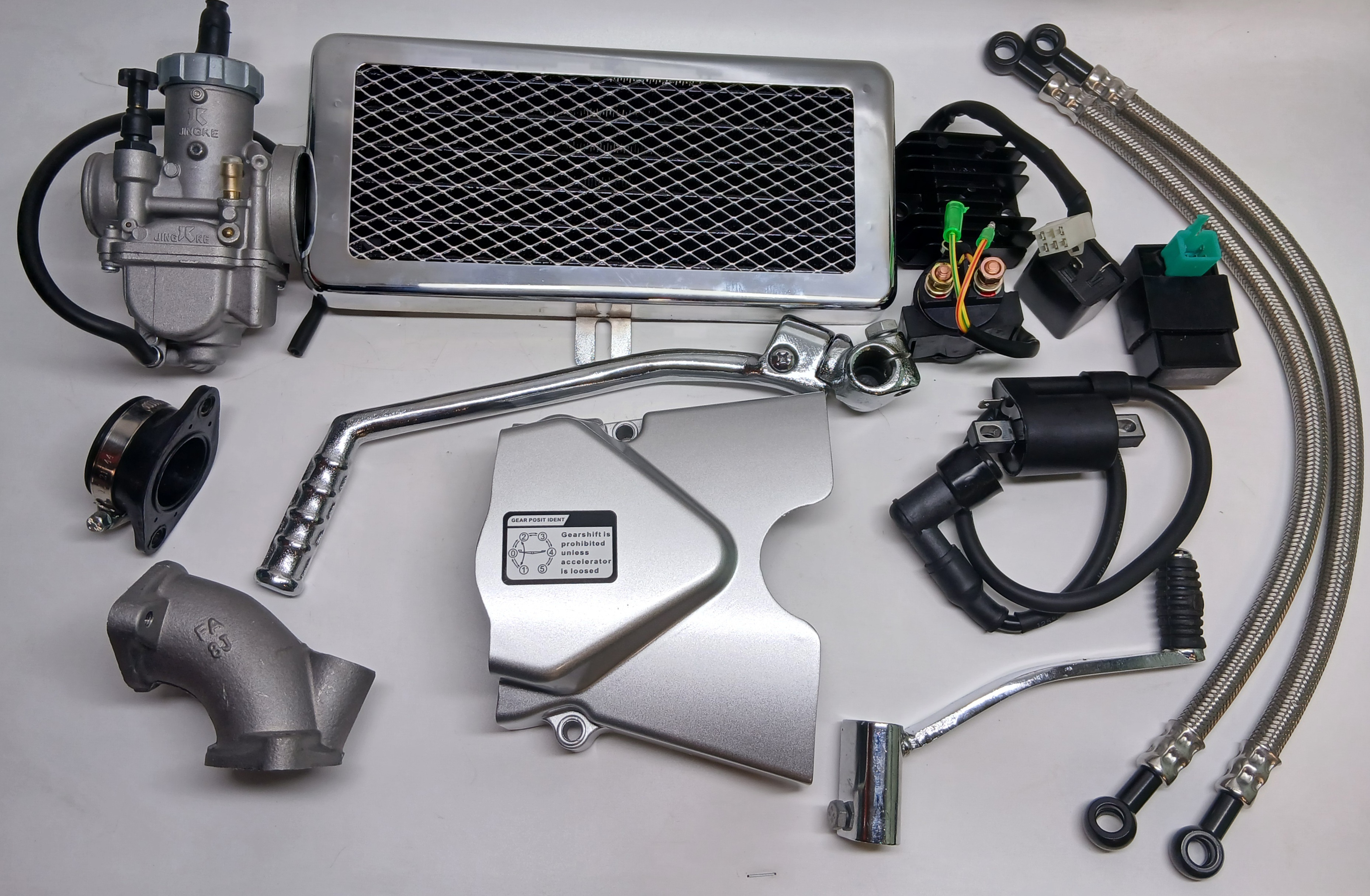 В комплекте: карбюратор, коммутатор, шланги для подключения радиатора (масленого охлаждения ), кикстартер, реле стартера, катушка зажигания, лапка кпп ,реле регулятор, крышка звезды, впускной патрубок с прокладками и болтами.
