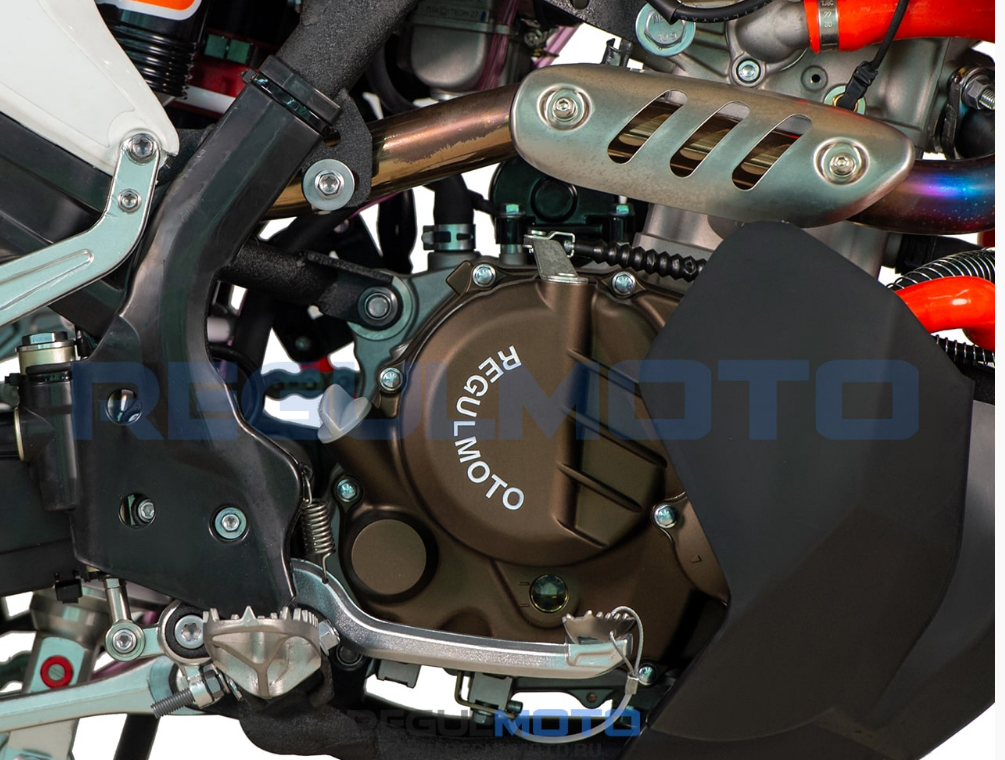 В мощной раме стоит модернизированная версия популярного одноцилиндрового мотоциклетного мотора 174MN-5 (NB300) производства компании Zongshen. Форсированный двигатель с 6-ступенчатой коробкой передач отличают выросший порог максимальной мощности, больший крутящий момент в диапазоне низких оборотов и более производительная система охлаждения. В тракте подготовки топливной смеси работает карбюратор PWK34 производства компании Nibbi Racing. Среди других особенностей подбора компонентов Regulmoto Crosstrec 300 необходимо отметить: