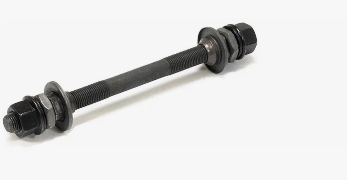 Ось передней втулки под гайку, 3/8 x 145мм, с гайками и конусами, черная