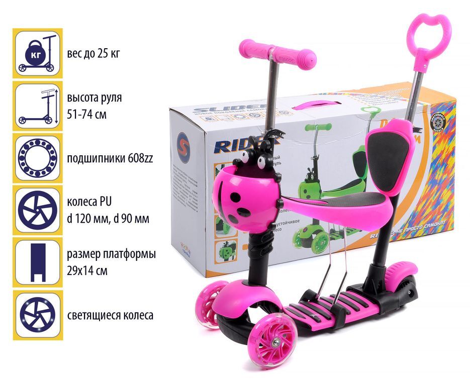 Самокат 3-колесный Slider Божья коровка 5 в 1, светящиеся колеса. розовый