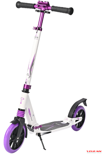 Прочная алюминиевая дека шириной 13.6 см и длиной 46 см покрыта износостойкой шкуркой (рабочая часть деки "footspace" - 33,5 см). Для удобства парковки самокат оборудован складывающейся подножкой.