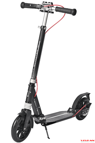 Прочная алюминиевая дека шириной 13.6 см и длиной 46 см покрыта износостойкой шкуркой (рабочая часть деки "footspace" - 33,5 см). Для удобства парковки самокат оборудован складывающейся подножкой.