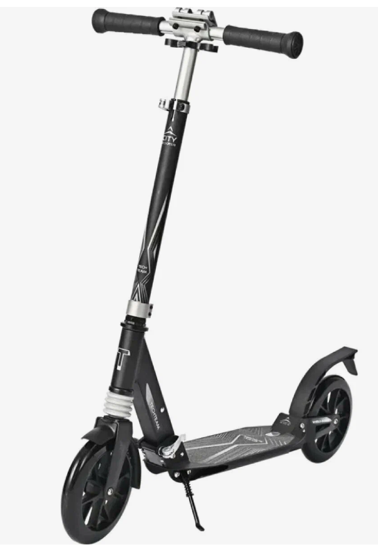 Прочная алюминиевая дека шириной 13.6 см и длиной 46 см покрыта износостойкой шкуркой (рабочая часть деки "footspace" - 33,5 см). Для удобства парковки самокат оборудован складывающейся подножкой.