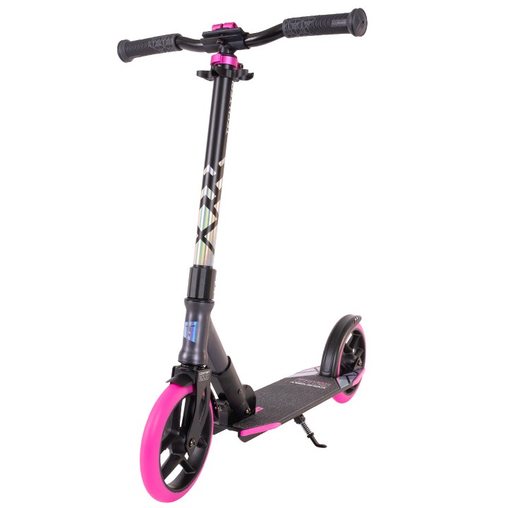 На самокате предусмотрена возможность крепления ремешка для переноски. На выбор покупателя предлагается четыре расцветки с голографическими наклейками.