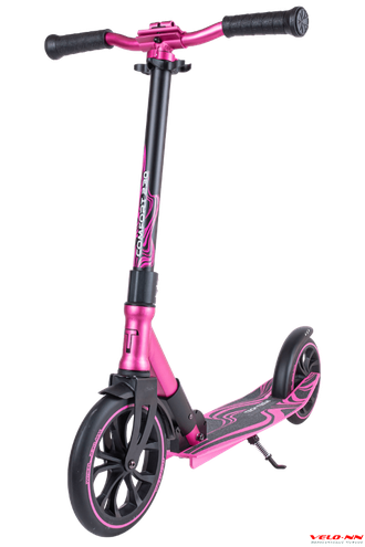 Дека длиной 58 см и шириной 15 см имеет футспейс 33 см, достаточный для размещения обеих ступней. Торможение осуществляется алюминиевым тормозом-крылом. Складывающаяся подножка позволит комфортно припарковать самокат на время отдыха.