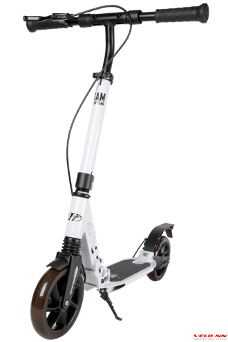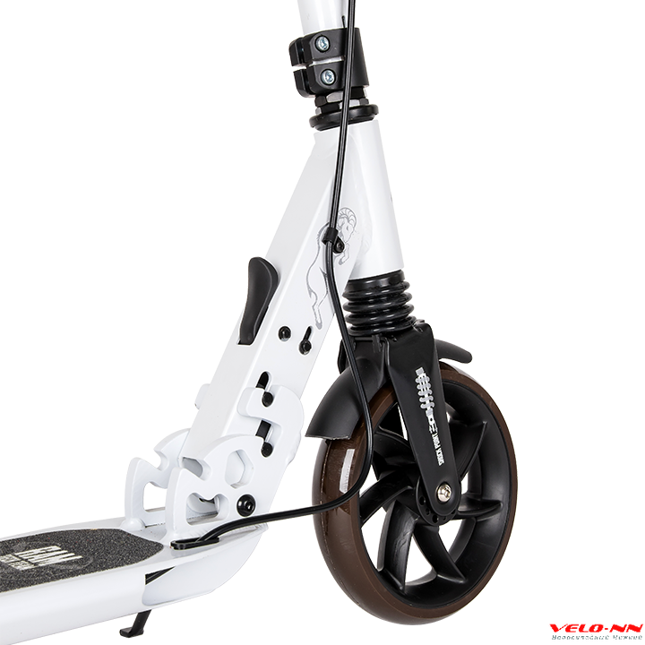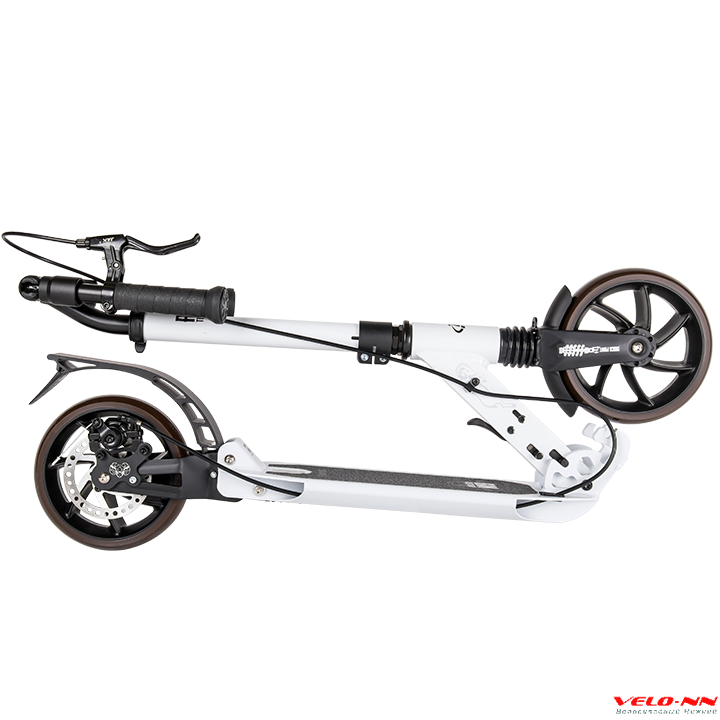 "Изюминка" модели - ручной дисковый тормоз, позволяющий не только выполнять эффективное торможение, но и по настоящему украшающий самокат. Тросик тормоза, в отличие от многих аналогов, проведен через специальные каналы в деке и не мешает езде.