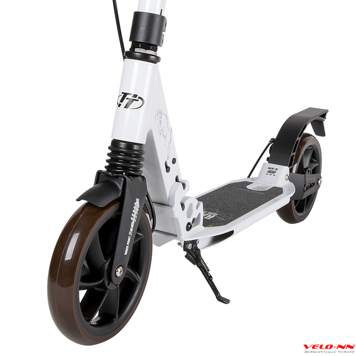 Прочная алюминиевая дека шириной 13.6 см и длиной 46 см покрыта износостойкой шкуркой (рабочая часть деки "footspace" - 33,5 см). Для удобства парковки самокат  оборудован складывающейся подножкой.