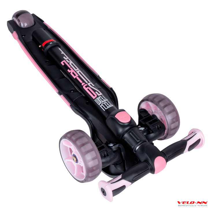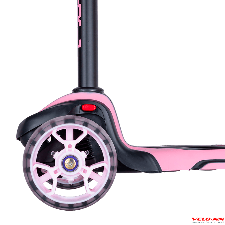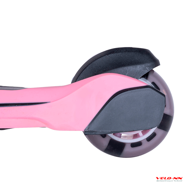 Колеса самоката широкие, выполнены из прочной пластмассы со специальным полиуретановым покрытием, обеспечивающим в совокупности с подшипниками стандарта ABEC 9, хорошие накат и амортизацию. Размер передних колес 120х40 мм, заднего - 80х50 мм. Заднее колесо оснащено крылом-тормозом. Все колеса самоката имеют так любимую детьми светодиодную подсветку, которая запускается при движении. Особенность подсветки в том, что благодаря применению прозрачного полиуретана в конструкции колес ребенок хорошо видит свечение.