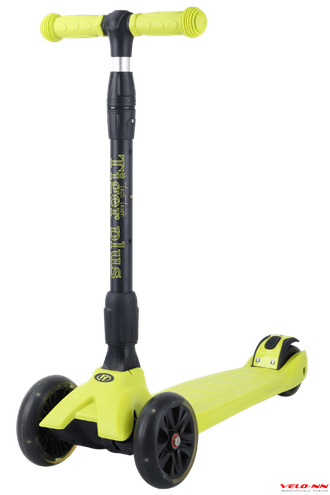 Колеса самоката выполнены из прочной пластмассы со специальным полиуретановым покрытием, обеспечивающим в совокупности с подшипниками стандарта ABEC 9, хорошие накат и амортизацию. Размер передних колес 135х36 мм, заднего (сдвоенного) - 90х48 мм. Заднее сдвоенное колесо оснащено крылом-тормозом. Все колеса самоката имеют так любимую детьми светодиодную подсветку, которая запускается при движении. Самокат представлен в четырех цветовых решениях.