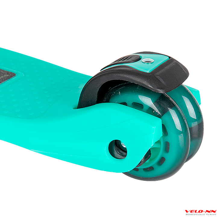 Колеса самоката широкие, выполнены из прочной пластмассы со специальным полиуретановым покрытием, обеспечивающим в совокупности с подшипниками стандарта ABEC 9, хорошие накат и амортизацию. Размер передних колес 120х40 мм, задних сдвоенных - 80х24 мм (каждое). Задние колеса оснащено крылом-тормозом.