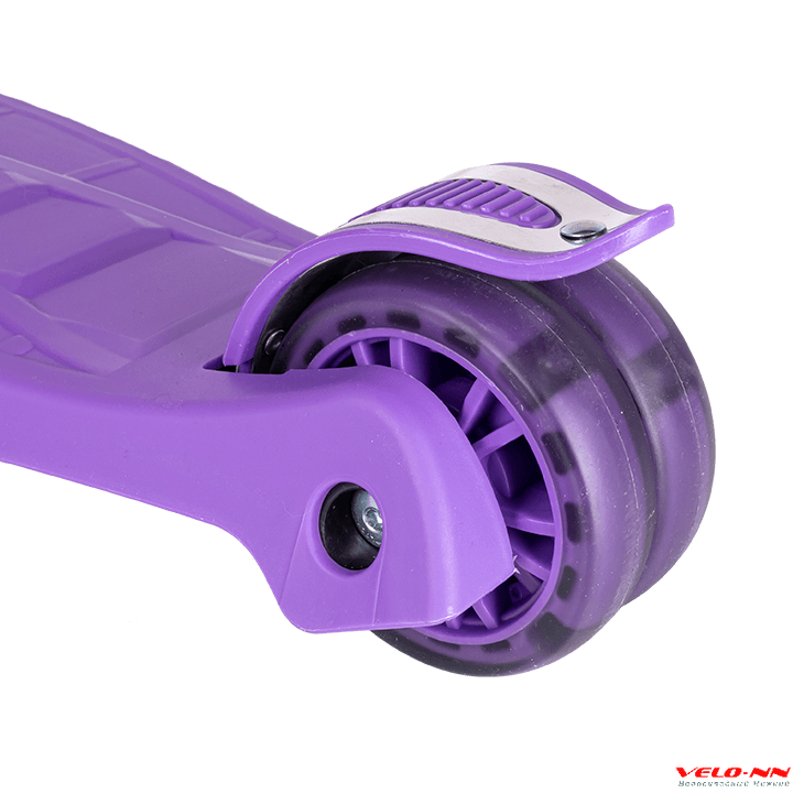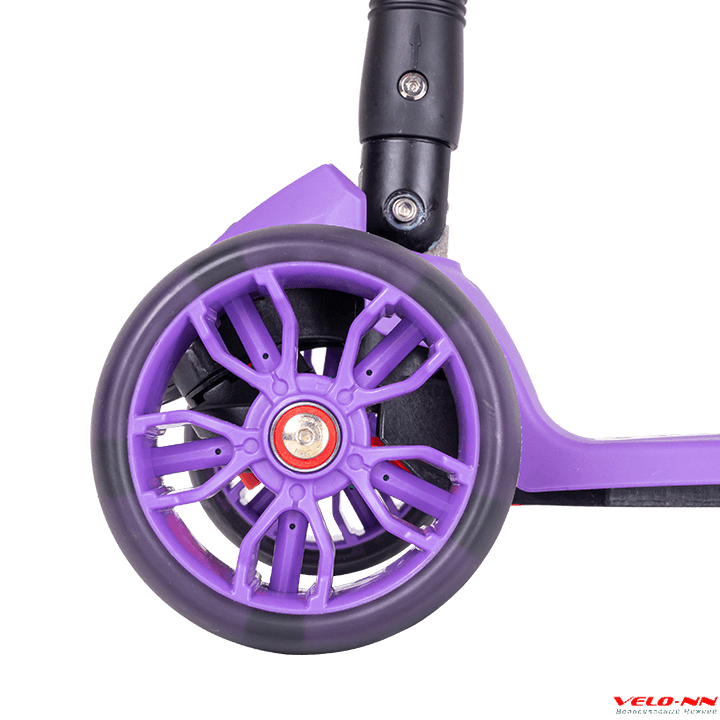 Колеса самоката выполнены из прочной пластмассы со специальным полиуретановым покрытием, обеспечивающим в совокупности с подшипниками стандарта ABEC 9, хорошие накат и амортизацию. Размер передних колес 135х50 мм, заднего (сдвоенного) - 90х24 мм. Заднее сдвоенное колесо оснащено крылом-тормозом с металлической пластиной-усилением. Все колеса самоката имеют так любимую детьми светодиодную подсветку, которая запускается при движении.