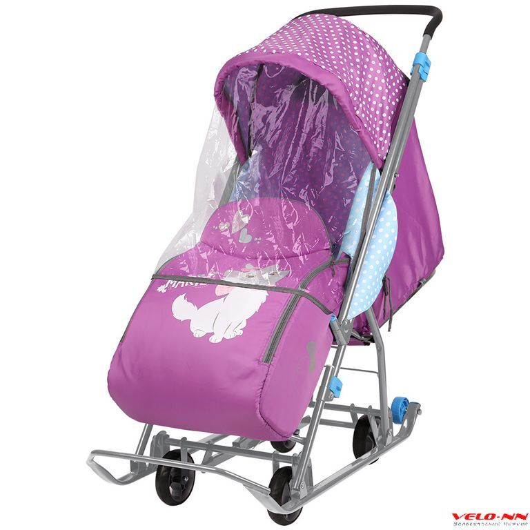 Удобно наличие чехла для ног с молнией – ребенка можно вынимать из санок, не отстегивая чехол. На плоских полозьях комбинированной коляски имеются колеса, благодаря которым коляску удобно катить по асфальту и участкам с растаявшим снегом. Спинка регулируется в трех положениях. Для безопасного катания ребенка имеется трехточечный ремень безопасности.