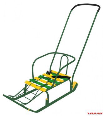 Материал: каркас – металл; сидение – рейки; ремень безопасности – ременная лента; колеса – морозостойкая пластмасса