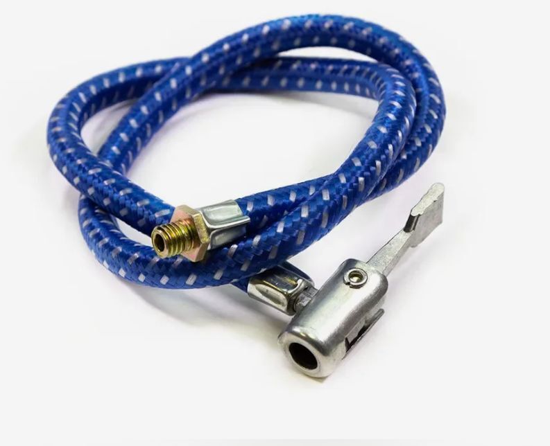 Шланг с зажимом BEE PUMP, для ножного насоса, под AV-ниппель, в тканевой оплётке, резина/пластик/сталь, серебристо-синий (250)