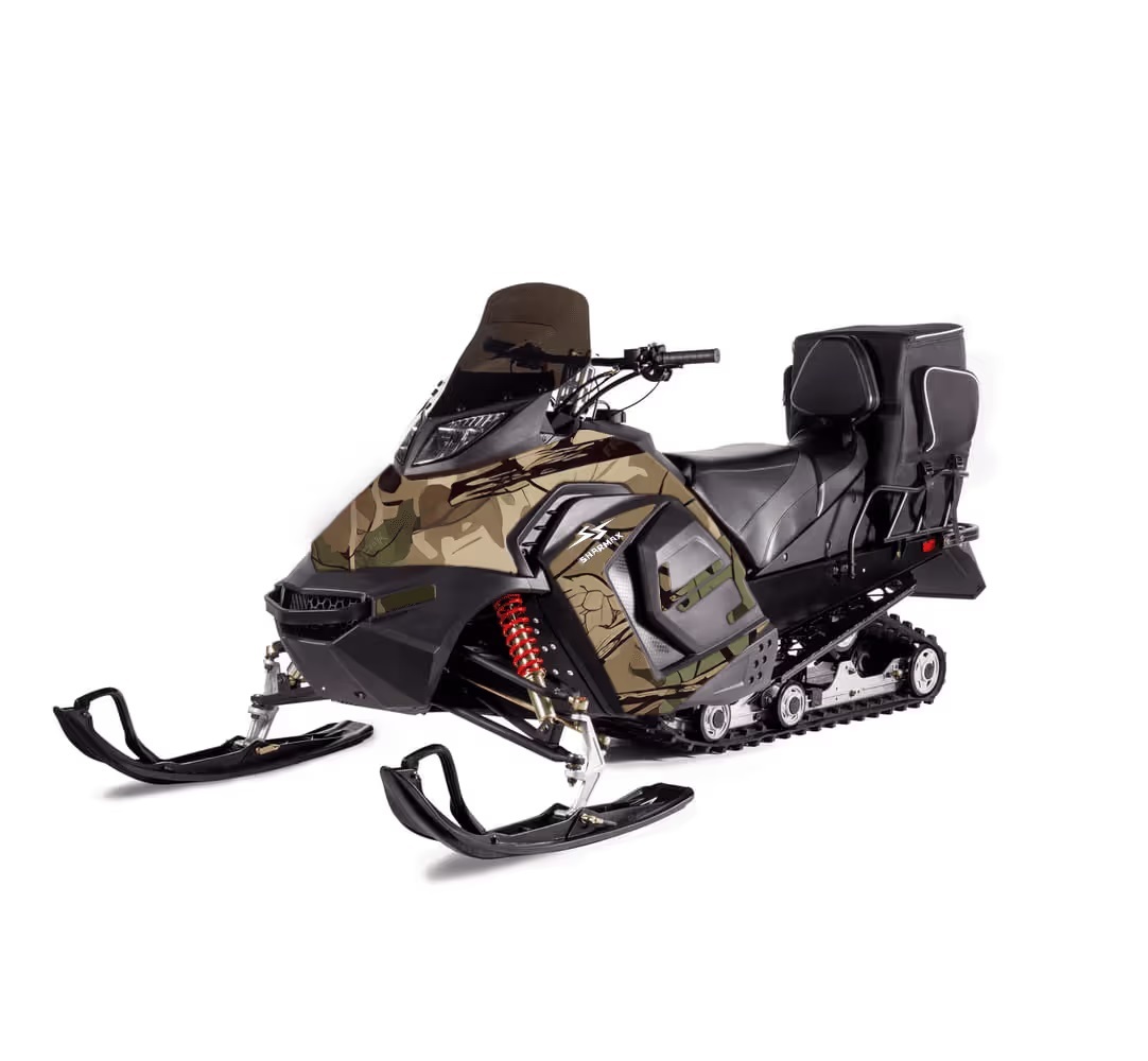 Передняя двухрычажная подвеска с поворотным рычагом повышает комфорт управления на любых скоростях. Задняя подвеска усилена для российских условий и прошла тесты в наших лесах. Ей не страшны большие нагрузки и перегруз самого снегохода.