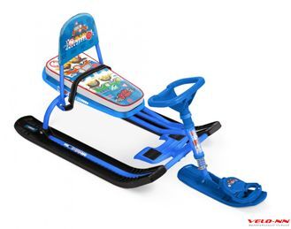Снегокат предназначен для перевозки детей от 4 до 12 лет по плотному снегу или льду, катанию с горок. Имеет сварную конструкцию из стальных труб, пластиковых элементов и мягкое сиденье, обтянутое  искусственной кожей с рисунком. Буксировочный трос с автоматической намоткой. Усиленный тормоз эффективен на обледенелой поверхности. Спинка съемная складная. Комплект наклеек на снегокат в подарок!