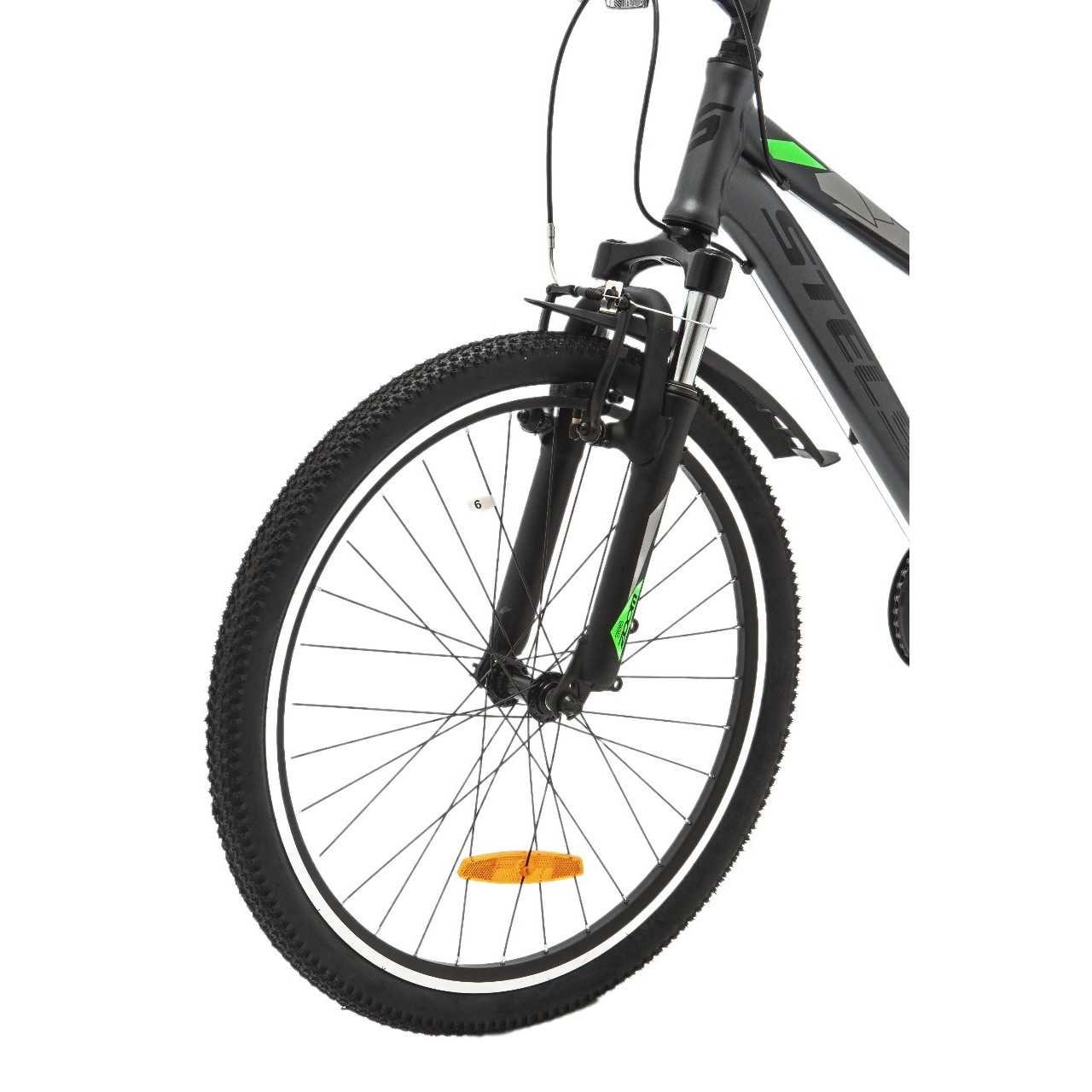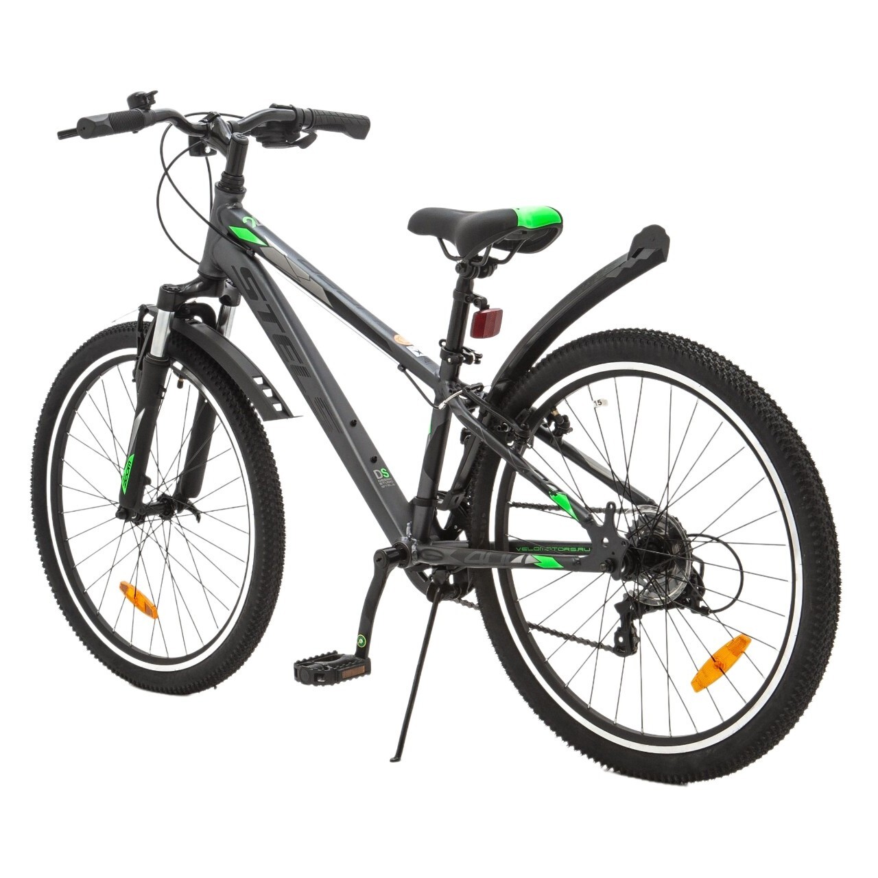 Велосипед, предназначенный для детей в возрасте от восьми до тринадцати лет, с навесным оборудованием Microshift, 6 скоростей. Технические особенности: прочная стальная рама (кареточный стакан BSA, интегрированный петух), амортизационная вилка (ход 50 мм, крепление калипера IS), двойные алюминиевые обода (под AV ниппель), надежные ободные тормоза V-типа, защита цепи, защита заднего переключателя, крылья, катафоты, звонок. Подходит для прогулочного катания в городских условиях и по несложным маршрутам в лесу. Диаметр колес - 24 дюйма. Вес - 15,42 кг.
