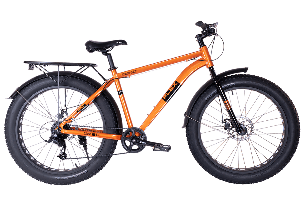 Вот мы и дождались новой модели велосипеда TT Flex 26 2022. Это всеми любимый фэтбайк, который пройдёт там, где все остальные застрянут. Повышенной проходимости сопутствуют широкие покрышки, спустив давление в которых, можно проехать даже по рыхлому снегу или песку. Шины стоят фирмы CST с говорящим названием BFT (что расшифровывается как BigFatTyre). Диаметр колёс – 26 дюймов, ширина покрышек составляет целых 4 дюйма, а ярковыраженные грунтозацепы позволят штурмовать даже самое лютое бездорожье. В общем-то, для суровых условий велосипед и предназначен – для леса, поля, парка, в городе ему будет не очень уютно.