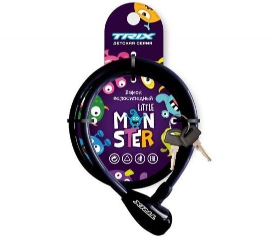 Замок противоугонный TRIX трос, ключи, детский, 12×800мм, Little Monster пластиковая оплетка, черный
