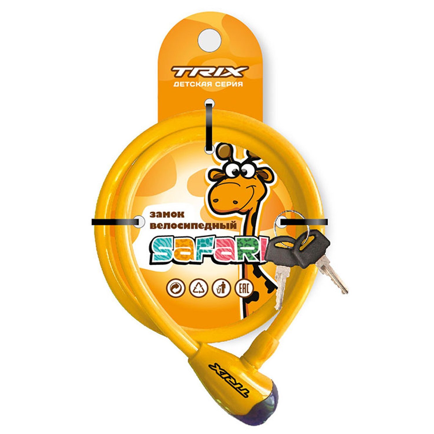 Замок противоугонный TRIX трос, ключи, детский, 8×1200мм, Safari, пластиковая оплетка, желтый