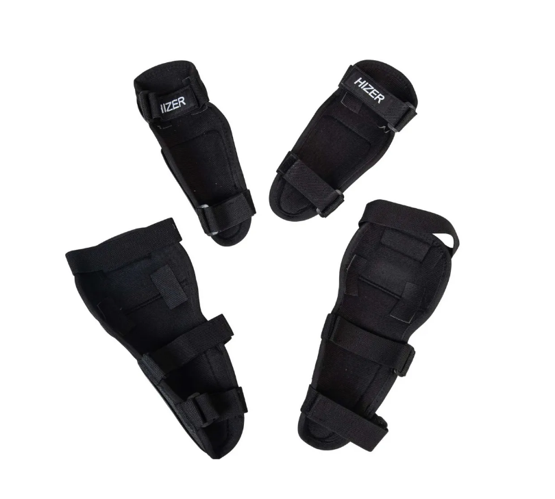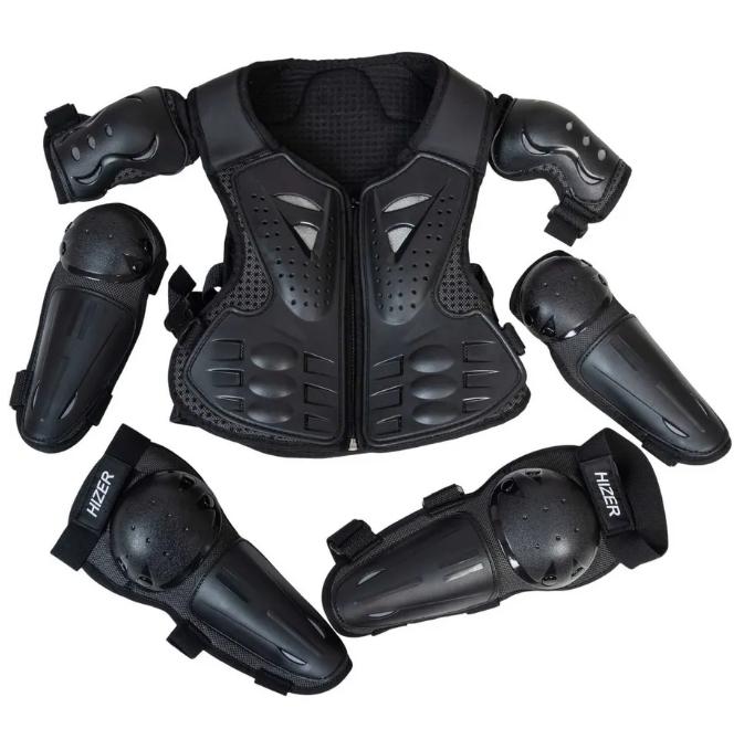Комплектация: Включает защиту для спины, груди, наколенники и налокотники. Регулировка: Удобные ремни и застежки для надежной фиксации на теле ребенка, что позволяет легко подгонять защиту под размер.